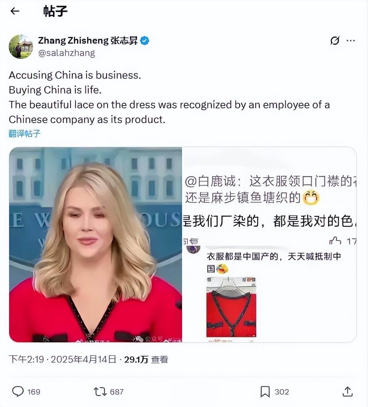 更尴尬的是,就连白宫发言人宣布对中国加关税这个消息时,她自己穿的衣服也全是中国制造。