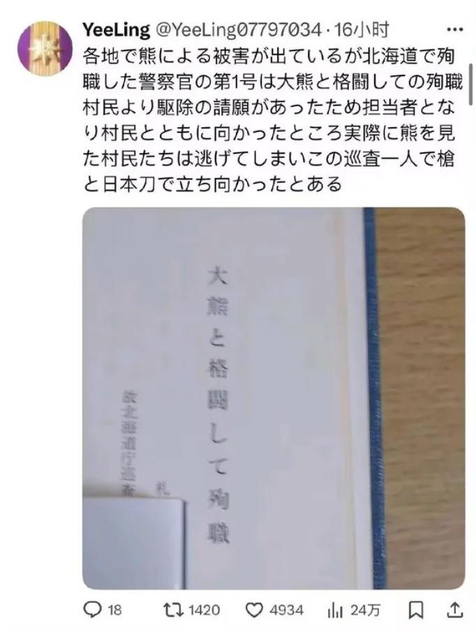 日本北海道一警察为了保护民众逃跑,掏出手枪和日本刀与熊搏斗,试图扮演太刀侠结果直接猫车等等搞笑场面。