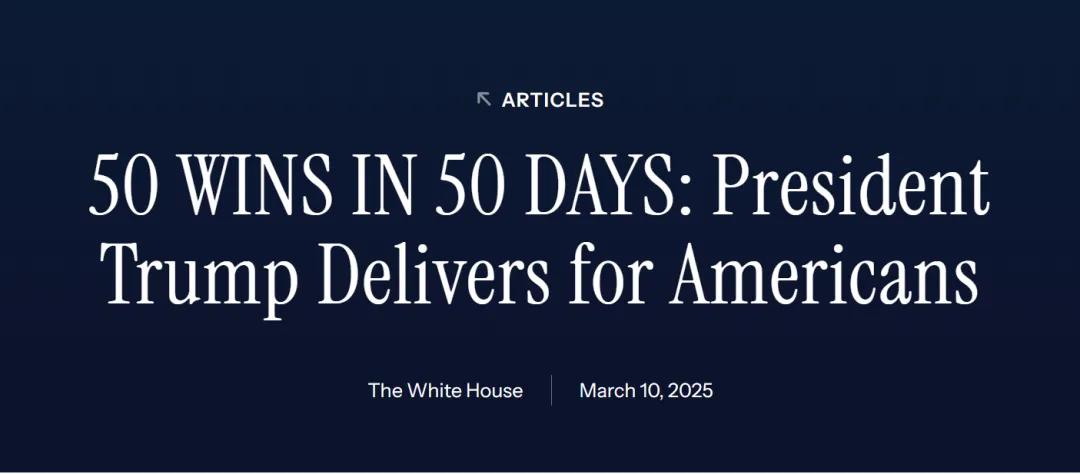 3月10号,白宫宣布特朗普上台后解决了美国50个重大问题,标题叫:50天赢了50次。