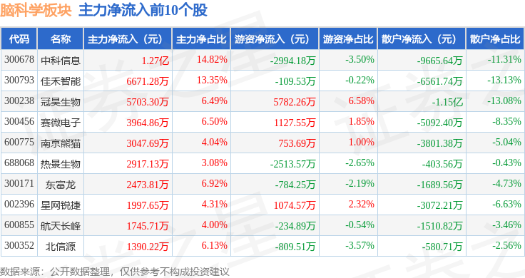从资金流向上来看,当日脑科学板块主力资金净流出6.49亿元,游资资金净流入5.81亿元,散户资金净流入6791.86万元。脑科学板块个股资金流向见下表: