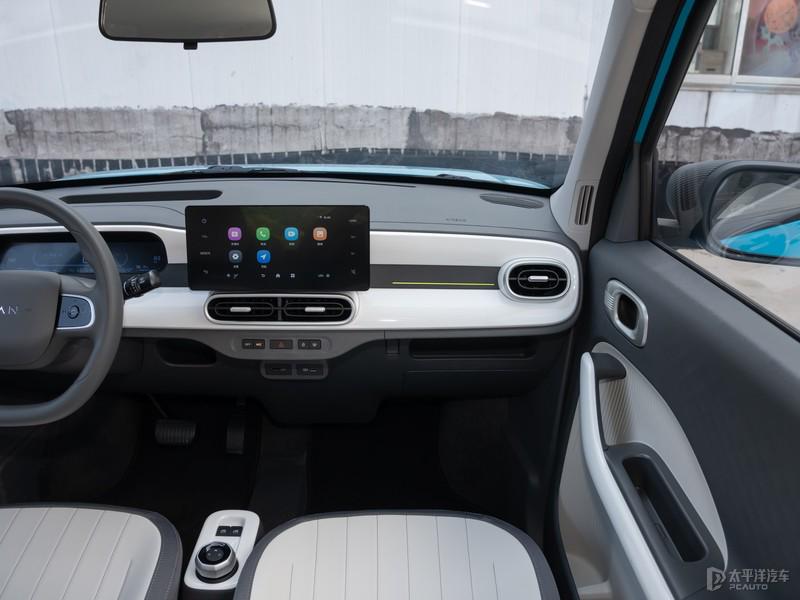 内部座舱以 \"欢趣乐玩\" 为核心,具体配置为9.2英寸全液晶仪表盘、双辐式的多功能方向盘和悬浮式设计的8英寸多媒体显示屏,同时搭配了旋钮样式的电子换挡机构。内饰颜色上,新车拥有樱花粉、城堡灰、森林绿与白色组合的3种双拼色可选。