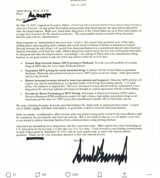 周四,特朗普在旗下社交媒体平台Truth Social上公开了他发给全球17家制药巨头的信件。这些公司包括了艾伯维、安进、阿斯利康、勃林格殷格翰、百时美施贵宝、礼来、EMD Serono、基因泰克、吉利德、葛兰素史克、强生、默克、诺华制药、诺和诺德、辉瑞、再生元以及赛诺菲。